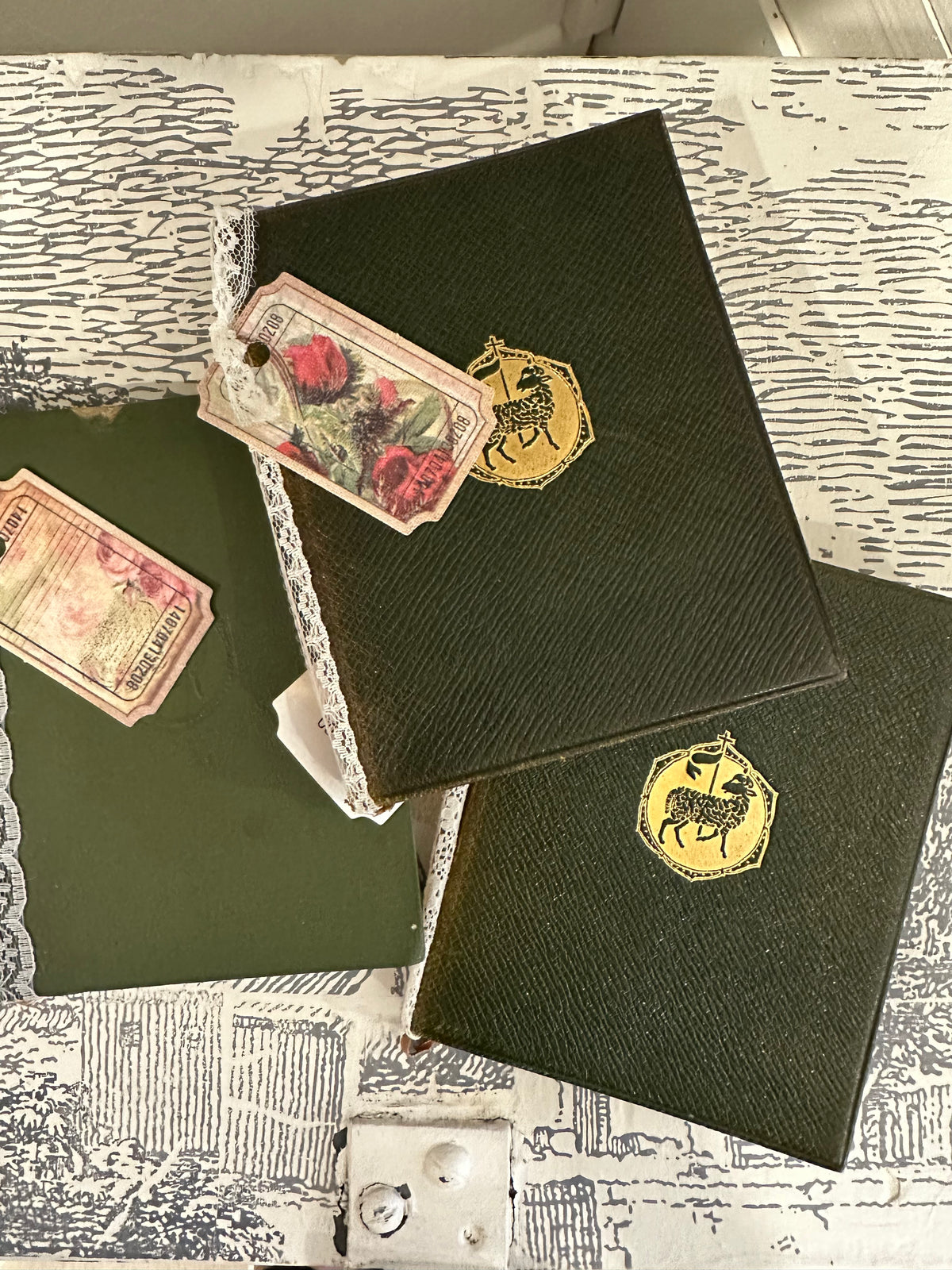 Mini green religious books with worn gold gilding titles. Choose from three sold as individual books